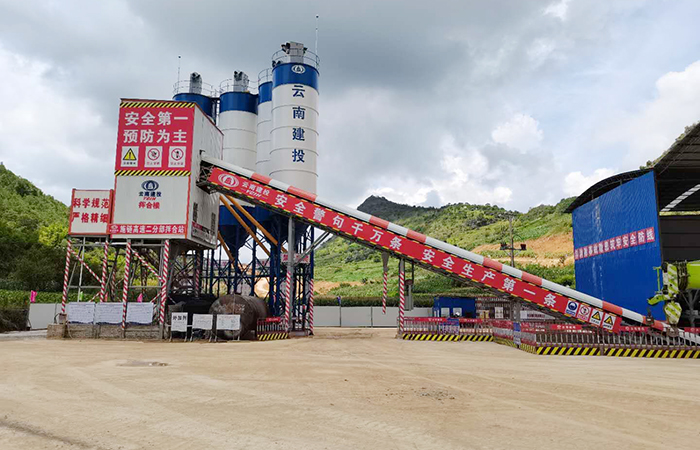 【拌合站概況】施鏈高速二分部自建拌合站選址于施甸縣萬興鄉(xiāng),拌合站具體位置為爛麥地右側(cè),K14+100左側(cè),占地面積9.93畝。考慮到復(fù)雜的周邊環(huán)境,拌合站在選址時(shí)依據(jù)了運(yùn)輸距離較短、征地及復(fù)墾量少,以及場地周圍無塌方、滑坡、落石、泥石流、洪澇等地質(zhì)災(zāi)害的原則,最終建設(shè)地距主線近,交通便利,便于原材料進(jìn)場及場內(nèi)生產(chǎn)的混凝土運(yùn)至施工現(xiàn)場,拌合站管理便利。拌合站設(shè)有砂、石堆料儲料倉,共設(shè)5個料倉(石料倉3個、機(jī)制砂1個、河沙1個),總體尺寸為78.6m×16m。