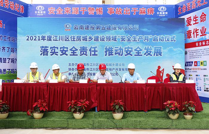 6月15日, 由玉溪市江川區(qū)住房和城鄉(xiāng)建設(shè)局主辦、玉溪市江川區(qū)興民房地產(chǎn)開發(fā)有限公司協(xié)辦,云南建投第五建設(shè)有限公司五〇一直管部承辦的江川區(qū)住房城鄉(xiāng)建設(shè)領(lǐng)域“安全生產(chǎn)月”啟動(dòng)儀式在書香苑二期項(xiàng)目舉行。玉溪市江川區(qū)住建局局長李竹貴、玉溪市江川區(qū)興民房地產(chǎn)開發(fā)有限公司經(jīng)理張文祥出席本次活動(dòng)。參加本次活動(dòng)的還有江川區(qū)住建局、質(zhì)安站等單位,以及江川區(qū)同行業(yè)企業(yè)的代表共計(jì)100人。
