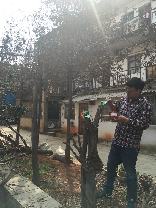 3月10日,直管部購(gòu)買了手鋸、油漆和手套。工具一到手,男職工們就不約而同地走向枯萎的樹木林里,對(duì)樹木檢查一番后,干脆地向樹枝壞死的地方“下手”,為樹木修剪“發(fā)型”,剪后又仔細(xì)地為“傷口”上漆,確保全范圍地覆蓋好傷口,避免對(duì)樹木造成二次傷害。接下來(lái)的兩天里,男職工們堅(jiān)持頂著烈日對(duì)修剪下來(lái)的樹枝進(jìn)行分解、清理,認(rèn)真做好后期的清運(yùn)工作。