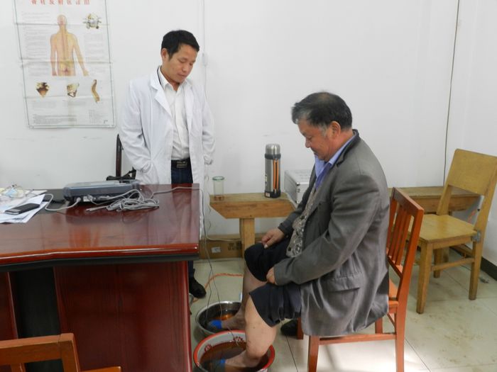 醫(yī)生為退休職工做理療保健
