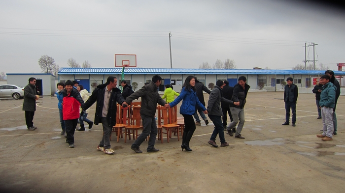 游戲分為兩個(gè)環(huán)節(jié)——“兩人三足”和“搶凳子”。“兩人三足”就是將兩個(gè)人的兩支腳綁在一起賽跑,兩人一組,每輪四組,最先到達(dá)終點(diǎn)的就算贏,經(jīng)過三輪比賽,范府和馬克海配合默契最終贏得第一名;接著是“搶凳子”,所有人站成一圈,圈內(nèi)擺好凳子,大家圍著凳子轉(zhuǎn),當(dāng)裁判喊停時(shí)未搶坐到凳子的就算輸,輸了就要表演節(jié)目。游戲現(xiàn)場(chǎng)緊張而激烈,吶喊聲、歡呼聲一片,雖然天氣寒冷,但大家的熱情絲毫不減。