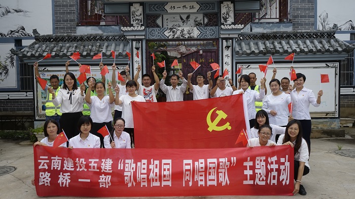 “我和我的祖國,一刻也不能分割……”悠揚的音樂聲響起,路橋一部二線員工舞動著五星紅旗,走出辦公室,在直管部門前集合,齊聲合唱《義勇軍進行曲》《建投之歌》和《我和我的祖國》。8月15日,路橋一部直管部所在地及各項目部駐地開展了“歌唱祖國,同唱國歌”主題活動,寧蒗、施甸、麗江、大理、昆明,幾個項目部與直管部異地同音,用自己的歌聲唱出了對祖國的美好祝愿。