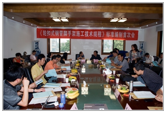 會上集團(tuán)技術(shù)中心主任王劍非宣讀了本標(biāo)準(zhǔn)的主編、參編單位。周建平處長宣布«輪扣式鋼管腳手架施工技術(shù)規(guī)程»編制組成立,這標(biāo)志著由我司作為第一主編單位的標(biāo)準(zhǔn)編制項(xiàng)目已正式啟動(dòng)。建設(shè)廳標(biāo)準(zhǔn)定額處周建平、建工集團(tuán)總工甘永輝對我司編制的«輪扣式鋼管腳手架施工技術(shù)規(guī)程»給予了很高的期望,會議研究通過了標(biāo)準(zhǔn)的參編成員名單、各工作組分工、編制工作大綱、編制工作規(guī)則及進(jìn)度計(jì)劃。
