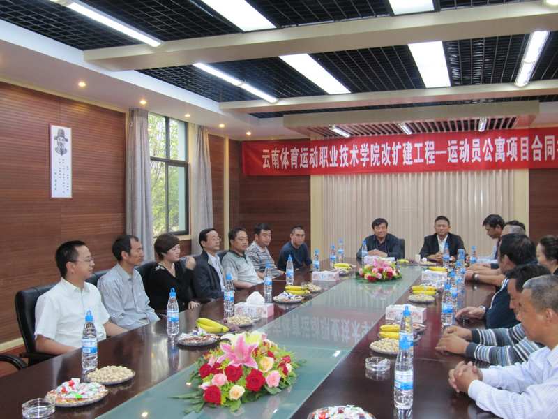 該工程的簽訂得到了云南省體育局和公司領導的重視,合同簽訂當天,省體育局局長沈俊鑌、建管中心主任曾延成、學院黨委書記兼院長李錫云及院領導班子,公司董事長楊福和、總經(jīng)理魏華、副總經(jīng)理張迎躍、經(jīng)營部負責人及直管部領導班子全部到場參加。沈俊鑌局長在簽訂儀式上表示,與五公司合作的第一個項目——云南體育運動職業(yè)技術(shù)學院教學大樓項目,得到了省體和學院的一致好評,所以有了第二次的合作,同時他表示,希望與五公司建立長期合作關(guān)系。楊福和也表示,無論項目大小,五公司都會以精品工程的要求去完成,一如既往地交上滿意答卷。