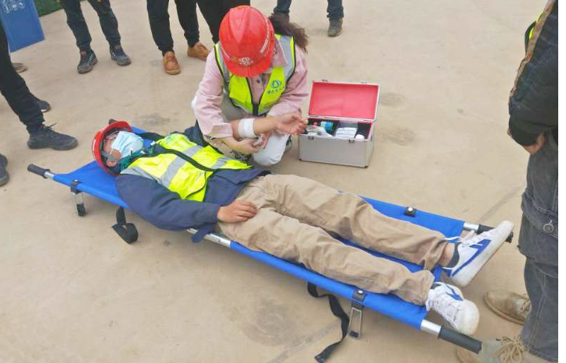 現(xiàn)場(chǎng)模擬:項(xiàng)目部實(shí)名制通道旁材料加工場(chǎng)突然發(fā)生火災(zāi),現(xiàn)場(chǎng)施工員發(fā)現(xiàn)后,第一時(shí)間組織人員撤離至安全區(qū)域,并要求班組長(zhǎng)組織人員集合清點(diǎn)人數(shù),然后將現(xiàn)場(chǎng)情況迅速上報(bào)應(yīng)急指揮組組長(zhǎng);應(yīng)急救援小組立即啟動(dòng)項(xiàng)目部應(yīng)急救援預(yù)案,有序組織項(xiàng)目人員安全疏散及采取有效的滅火措施;救援途中發(fā)現(xiàn)一名工人神志不清,呼吸微弱,現(xiàn)場(chǎng)醫(yī)療救護(hù)組立即將該名工人撤離到空曠場(chǎng)地,讓其就地仰面平躺,且確保氣道暢通,用5秒時(shí)間,呼叫傷員輕拍其肩部,以判斷傷員是否意識(shí)喪失,同時(shí)撥打急救電話,在等待外部救援的同時(shí),對(duì)傷員進(jìn)行心肺復(fù)蘇。隨著大火的撲滅以及傷員得到及時(shí)搶救,此次演練圓滿結(jié)束